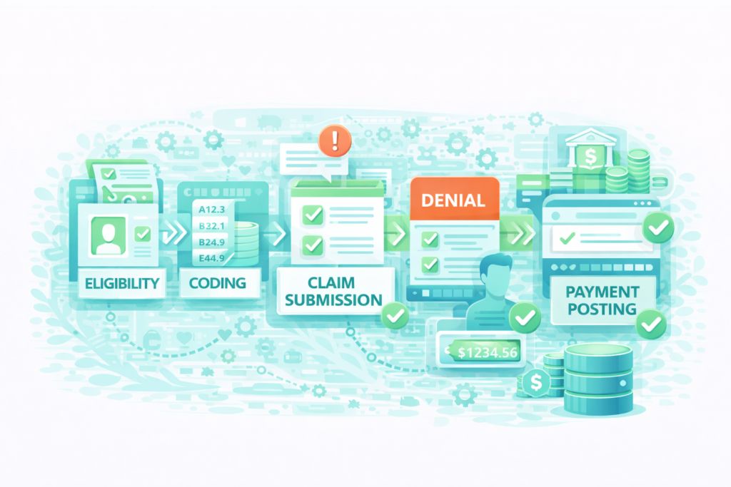 Our team supports your entire revenue cycle through structured workflows, proactive follow-ups, and transparent tracking. From eligibility verification and claim submission to payment posting, A/R follow-ups, and denial resolution, we help reduce revenue leakage, improve collections, and keep your operations efficient, compliant, and financially healthy.